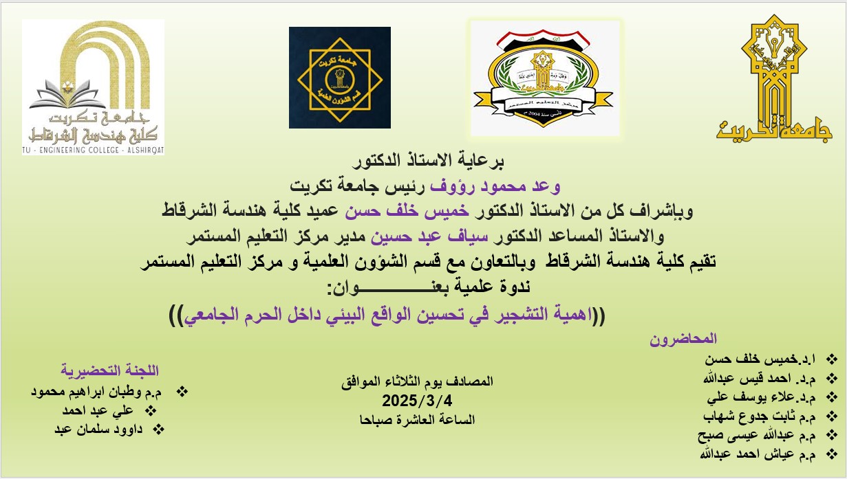 وفي إطار تعزيز الوعي البيئي، نظّمت وحدة التشجير في الكلية ندوة توعوية بعنوان "أهمية التشجير في تحسين الواقع البيئي داخل الحرم الجامعي"، حيث ناقش المختصون دور التشجير في تقليل التلوث البيئي، وتحسين جودة الهواء، وتوفير بيئة مستدامة وصحية للطلبة والأساتذة. كما تناولت الندوة تأثير الأشجار في الحد من التغيرات المناخية، وتعزيز الغطاء النباتي داخل المؤسسات التعليمية.