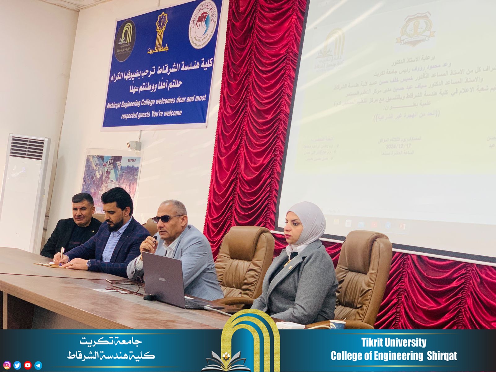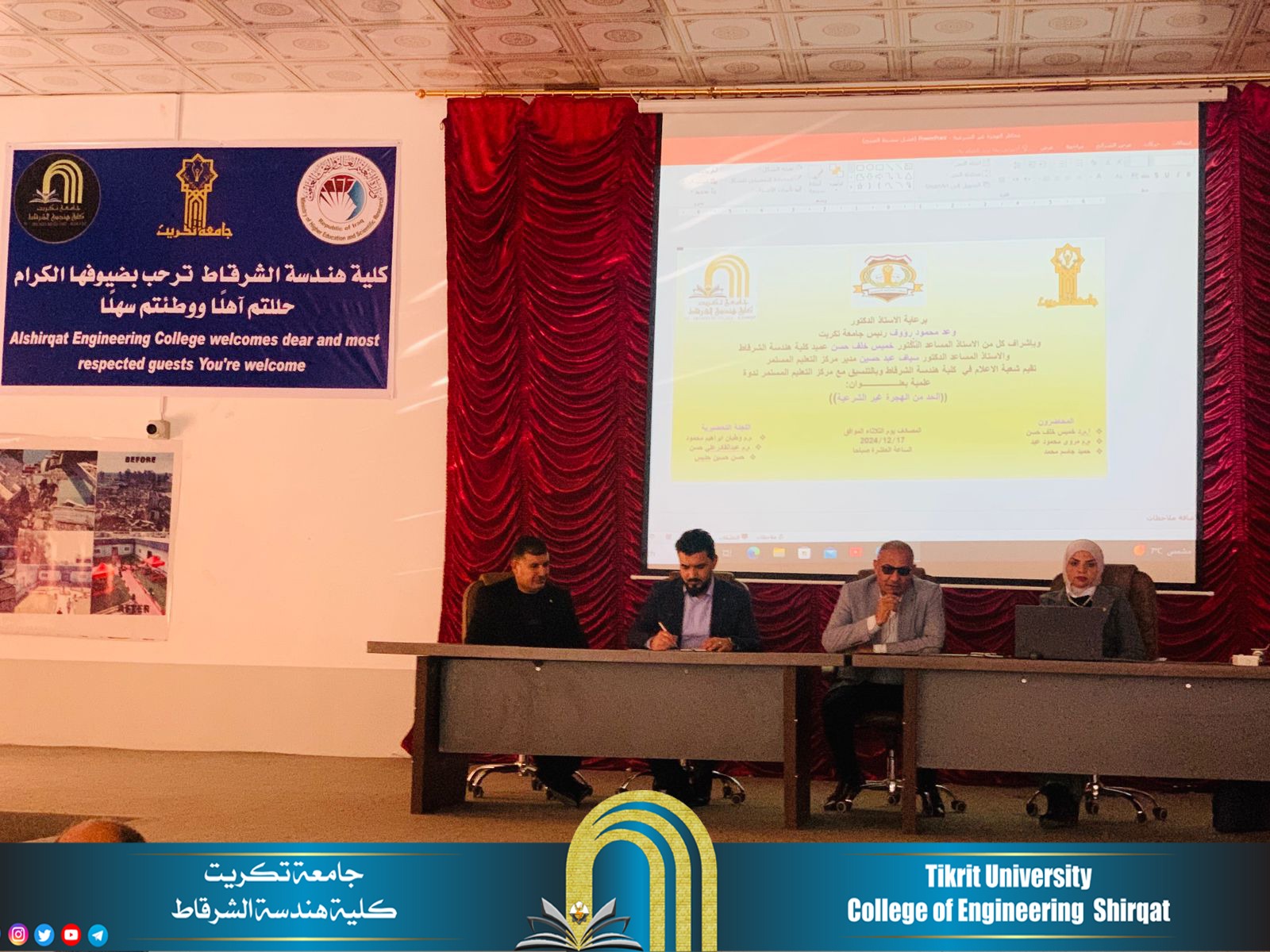 برعاية السيد رئيس جامعة تكريت الاستاذ الدكتور وعد محمود رؤوف وبأشراف كل من السيد عميد كلية هندسة الشرقاط الأستاذ المساعد الدكتور خميس خلف حسن المحترم والاستاذ المساعد الدكتور سياف عبد حسين مدير المحترم مركز التعليم المستمر تقيم شعبة الإعلام ووحدة التأهيل والتوظيف في كلية هندسة الشرقاط و وحدة التعليم المستمرفي الكلية (ندوة تثقيفية ) تحت عـنـــــــــــوان
